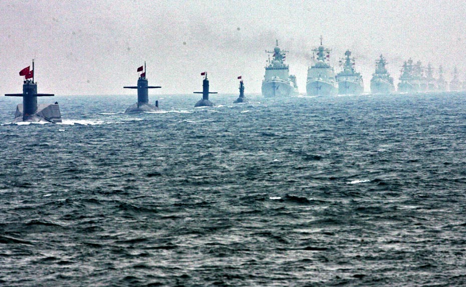 4月23日下午,为纪念中国人民解放军海军成立60周年而举行的海上阅兵在青岛附近黄海海域举行。海上检阅式分两个阶段,第一阶段为海上分列式,检阅中国海军的舰艇和飞机;第二阶段为海上阅兵式,检阅来自14个国家的21艘舰艇。图为接受检阅的中国海军潜艇编队、水面舰艇编队。 中新社发 宋吉河 摄