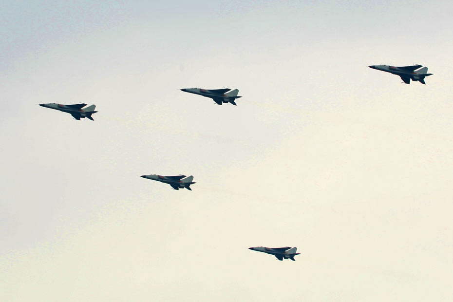 4月23日下午,为纪念中国人民解放军海军成立60周年而举行的海上阅兵在青岛附近黄海海域举行。海上检阅式分两个阶段,第一阶段为海上分列式,检阅中国海军的舰艇和飞机;第二阶段为海上阅兵式,检阅来自14个国家的21艘舰艇。图为海军航空兵震撼登场。中新社发 宋吉河 摄