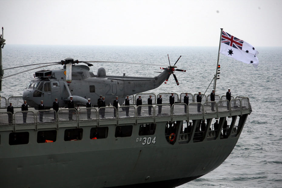 中国历史上的首次多国海军检阅活动四月二十三日下午在青岛附近黄海海域举行。中国国家主席、中央军委主席胡锦涛乘阅兵舰“石家庄”号导弹驱逐舰,检阅中国海军的潜艇、水面舰艇、海军航空兵和海军陆战队等作战兵种,并检阅了来访的十四个国家的二十一艘舰艇。图为参加检阅的外国军舰。中新社发 张雷 摄