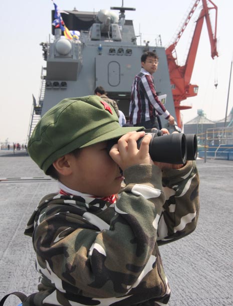 4月22日,纪念中国人民解放军海军成立60周年多国海军军舰开放日活动在青岛港码头举行。图为一名小朋友在韩国独岛号上参观。 中新社发 郭国权 摄