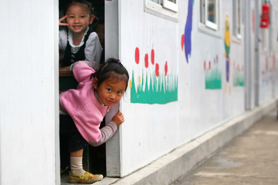 5月11日,小学生在板房搭建的学校里嬉戏。四川省绵阳市安县在去年大地震中受灾严重,目前全县规划恢复重建学校49所,包括高中、职业中学、初中、小学等,规划总建筑面积38万多平方米。中新社发 富田 摄