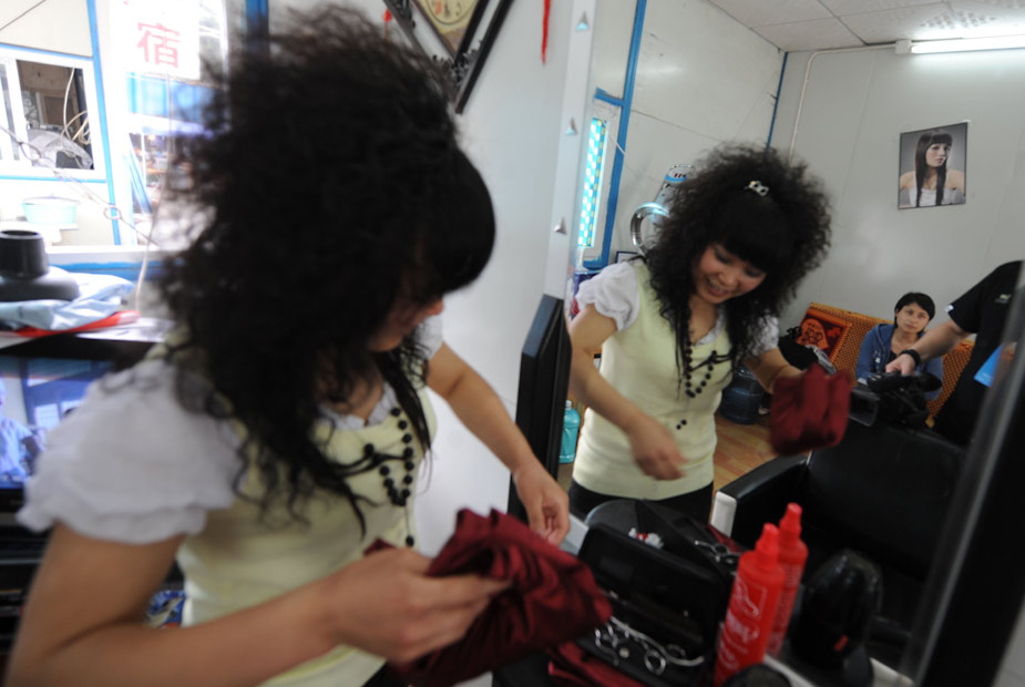 映秀镇21岁的受灾姑娘小云,租借板房开设“80后”美容美发室,在此地小有名气。中新社发 贾国荣 摄