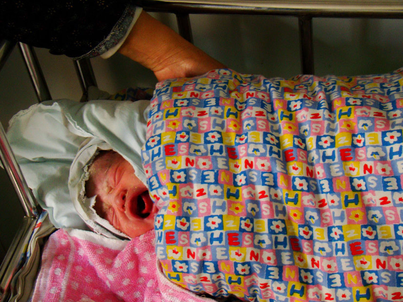 4月23日,在汶川大地震极重灾区什邡市妇幼保健院的板房医院内,震后有伤亡家庭再生育的妇女王尧芳产下了一个健康的小宝宝。记者了解到,王尧芳家住什邡市红白镇,在该镇做裁缝。她11岁的儿子小明在去年的“5.12”汶川大地震中遇难。中新社发 肖龙联 摄
