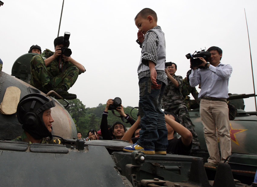 4月25日,汶川大地震幸存者“敬礼娃娃”郎峥一家来到成都军区驻渝某部营区,感谢该部战士在废墟中救出郎峥的性命。2008年5月13日晨,3岁的郎峥被解放军官兵从废墟里救出后,躺在一块小木板做的临时担架上,用他稚嫩的右手向8位抬着他的解放军叔叔敬了个少先队礼,他的举动引起社会各界高度关注,被媒体称为“敬礼娃娃”。图为郎峥在营区内见到梦寐以求的坦克,爬到坦克车上用一个军礼向解放军叔叔表示感谢。中新社发 郭晋嘉 摄