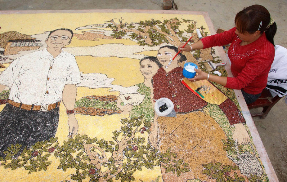 温家宝总理两度探望的四川大地震极重灾区青川县黄坪乡,村民正用五谷杂粮制作大型粘贴画:“总理来到枣树村”,艺术性再现他亲临枣树村关心慰问乡民的情景。该画高1.83米,宽3.05米,以木板为底,画面色彩全部用当地盛产的玉米、黄豆、小豆、黑豆、荞麦等二十多种杂粮拼贴,表达了村民与国家领导人的真挚朴实感情。中新社发 沈若飞 摄