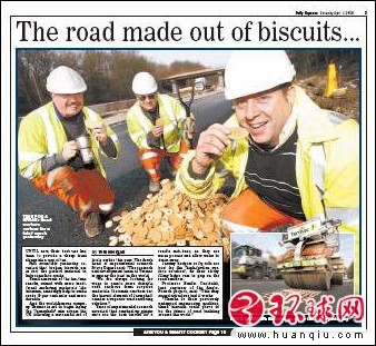 英国建筑工人用饼干铺路的“假新闻”是由《每日快报》报道的,该报称,一些工人将饼干整齐地排列在路面上,然后用压路机压过,因为用饼干铺路,将会使道路更加坚固和耐用。但《每日快报》又在另一个版面的角落,承认“饼干铺路”的故事是愚人节的一个玩笑。