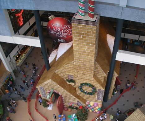 2、世界最大的姜饼屋 世界最大的姜饼屋可能正好比你家大,其面积居然多达135平方米,是由1.4万磅(合6342千克)姜饼和4750磅(合2152千克)糖霜建造而成的。姜饼艺术家罗格·皮尔泽花了1700个小时才建造此房屋,成为世界最大的姜饼屋,并于2006年展示在美国购物中心里。