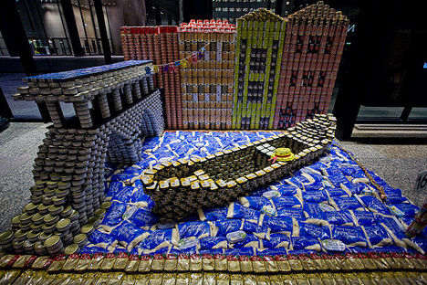 9、罐头建筑 当你还是孩子时,你可能还记得在学校将罐头食品堆成摩登塔,但这远没有此罐头建筑那么令人印象深刻。加拿大多伦多大学的学生和专业建筑师组成的团队,用罐头设计和建造了商行和公司,酷似儿童课本上的插图。此外,他们还设计和建造了城市风景、树木、蜜蜂甚至积木搭建的人。