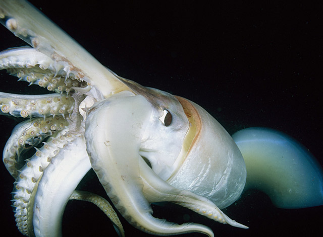 一只洪德堡鱿鱼瞪着锐利的眼睛在美国加州墨西哥海湾搜寻猎物。此最大鱿鱼可长到2米长,重达45公斤。墨西哥渔民称这种好斗的动物为“迪阿宝罗斯·罗嘉斯”,也称红色恶魔。当它们被网住拖上船时,常常会从漏斗状喷孔里喷出水。此鱿鱼一旦伪装失败,就以墨水作为另一种防卫措施。科学家估计加州墨西哥海湾里生活有一千多万只这种鱿鱼。