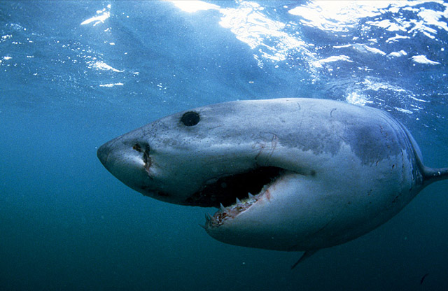 在南非的干斯拜(Gansbaai)水域,一只大白鲨正在巡游,它有着如匕首般锋利的牙齿。在南非海域大白鲨是受保护的,当它们被疯狂猎杀之后,喉骨就是战利品,用于制作工艺品,在亚洲鱼市上进行交易。它们通常是在刺网中窒息而死。