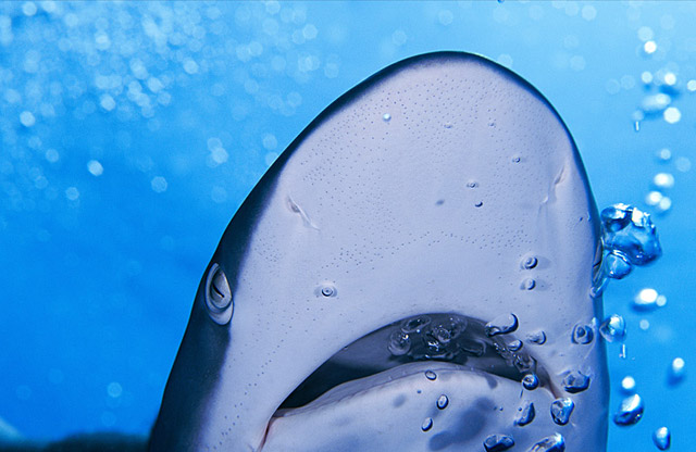 灵敏的嗅觉可以让丝鲨搜寻到古巴南部海域中的猎物。此鲨鱼嘴上的凹陷处标明这是电磁传感器,可以帮助它们察觉到周围猎物最微小的肌肉运动,甚至它们的心跳也能感觉得到。
