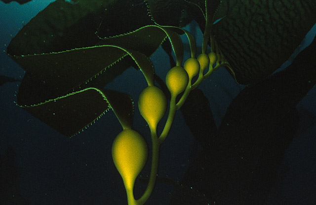一种庞大的气囊状褐藻堪称是海洋里的红杉,飘浮在美国加利福尼亚的洋流中。巨型褐藻可以长到61米长,它具有双重用途:一是为海洋生物提供栖息地和营养物质;二是褐藻胶的原材料,在食品加工中用作稳定剂、增稠剂和凝胶剂。