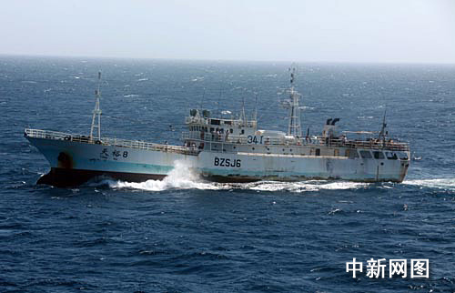 二月八日下午,“海口”舰在索马里海域与“天裕八号”渔船会合,当即组成护航编队,伴随护航向东航行。(中新网记者 孙自法 摄)