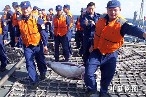 二月八日下午,“海口”舰在索马里海域与“天裕八号”渔船会合,当即组成护航编队,伴随护航向东航行。(中新网记者 孙自法 摄)