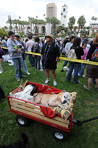 4月11日,在美国洛杉矶人们欢庆复活节的同时,也为他们的宠物举行了祝福仪式。这项祝福仪式每年举行一次,今年第一个被祝福的是农场里的动物。
