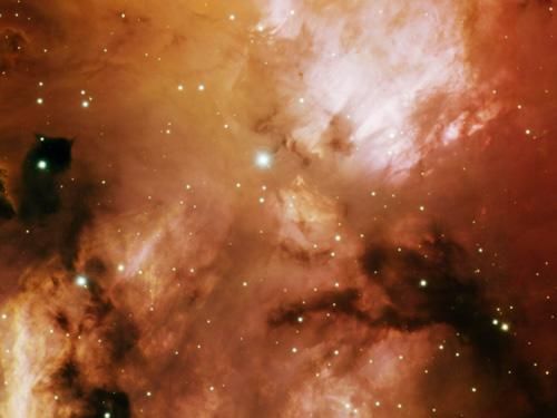 事实上,恒星形成区并非千篇一律都是明亮的区域。本图所显示的“NGC 3582”星云就证明了这一事实。“NGC 3582”星云位于船底座,距离地球大约1万光年。图中,黑暗模糊的尘云与年轻恒星的紫外线所激活的发光气体共同充满了星云的各个角落。