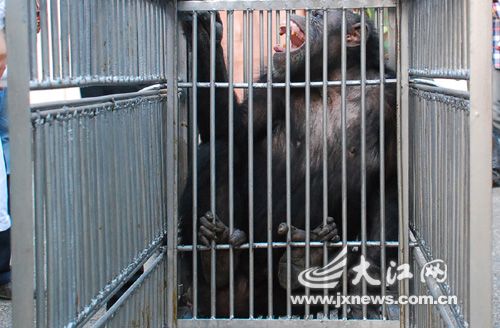 图为在被抬进手术室前,南昌动物园的黑猩猩“壮壮”躁动不安,不停嚎叫。