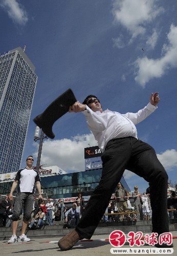 2008年4月,在德国柏林的电视塔附近,一名男子参加扔胶靴大赛。这项趣味赛事起源于芬兰,目前最高纪录是60多米。