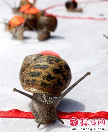 英国的诺福克郡举行了一场世界蜗牛赛跑冠军赛。总共有200只从全世界选拔出来的蜗牛赛跑名将一决高下。不过,它们爬一厘米的距离也需要近6秒钟的时间,观看比赛的观众需要有极大耐心。当天,人们给一张桌子上铺了桌布并喷了水,以便给蜗牛提供最佳的爬行条件,比赛的总距离是13英寸(约33厘米)。最终166号选手海骐一路过关斩将,以3分零2秒的成绩获得冠军。