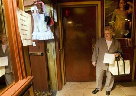 英国媒体日前发布了一组照片,一家脱衣舞俱乐部为了“救市”,举行了别开生面的招聘会,而众多应聘者表示什么都愿意做。现年50岁的Karen Bradner女士曾在一家公司担任秘书,如今已经失业一年。图为Bradner女士笑望一件脱衣舞娘的演出服。