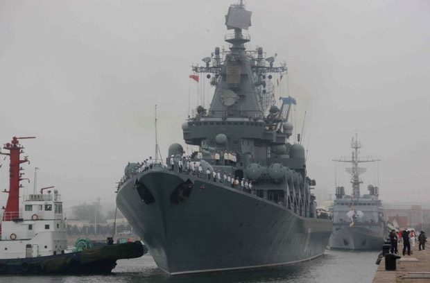 庆祝中国人民解放军海军成立六十周年多国海军活动,二十日在中国青岛拉开帷幕。14个国家共派出21艘舰艇参加此次活动。图为俄罗斯海军“瓦良格”号导弹巡洋舰、“MB-99综合辅助船”。王建民 摄
