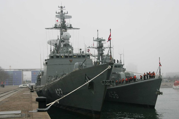 庆祝中国人民解放军海军成立六十周年多国海军活动,二十日在中国青岛拉开帷幕。14个国家共派出21艘舰艇参加此次活动。图为泰国海军“达信”号导弹护卫舰和“邦巴功”号导弹护卫舰(右)。 王建民 摄