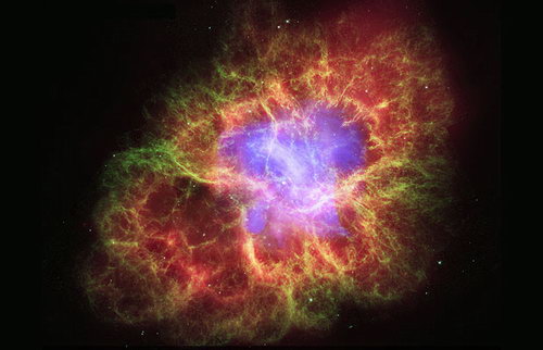 蟹状星云(M1,或NGC 1952)位于金牛座ζ星东北面,距地球约6500光年。它是个超新星残骸,源于一次超新星爆炸。图中显示是哈勃拍到恒星爆炸时释放出大量粒子的瞬间。