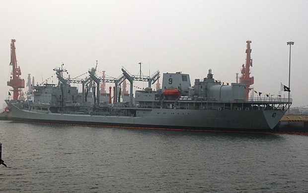 庆祝中国人民解放军海军成立六十周年多国海军活动,二十日在中国青岛拉开帷幕。14个国家共派出21艘舰艇参加此次活动。图为巴基斯坦“纳斯尔”号补给舰 。葛怀宇 摄