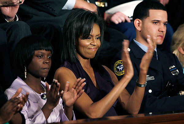 米歇尔在参加参众两院联席会议时,为丈夫鼓掌加油。