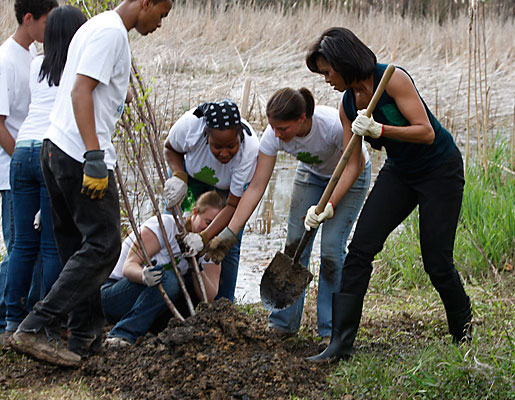 4月21日(即地球日)米歇尔与志愿者们在公园种树。
