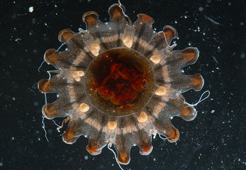 在黑暗的深海环境下,光线只能来自生物体自身的发光功能,而光线可以使它们找到伴侣或引诱到猎物。但是,如果透明的动物吃掉了一个发光动物,然后捕食者的肚子开始闪烁,就能让自己发光吸引更多饥饿的生物。科学家们认为,许多深海动物,就像这只肚子周围有红色细胞海蜇,让猎物的光可以从自己体内发射出去,借此吸引更多饥饿的生物前来。