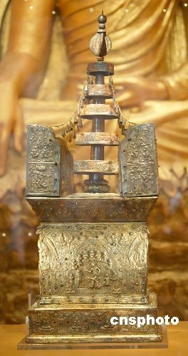江苏省南京市博物馆“五·一”将在朝天宫崇圣殿举办《圣塔佛光——七宝阿育王塔特别展》,届时,鎏金七宝阿育王塔、随铁函出土的水晶珠、金凤凰、铜钱等都将首次公开亮相。2008年南京长干寺地宫出土的阿育王塔,是至今为止中国发现的最大鎏金七宝阿育王塔。 中新社发 吴俊 摄