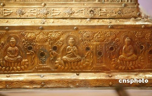 江苏省南京市博物馆“五·一”将在朝天宫崇圣殿举办《圣塔佛光——七宝阿育王塔特别展》,届时,鎏金七宝阿育王塔、随铁函出土的水晶珠、金凤凰、铜钱等都将首次公开亮相。2008年南京长干寺地宫出土的阿育王塔,是至今为止中国发现的最大鎏金七宝阿育王塔。 中新社发 吴俊 摄