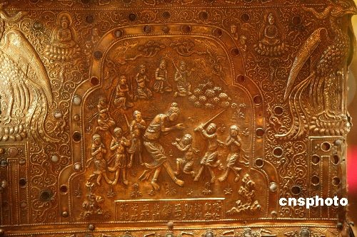 江苏省南京市博物馆“五·一”将在朝天宫崇圣殿举办《圣塔佛光——七宝阿育王塔特别展》,届时,鎏金七宝阿育王塔、随铁函出土的水晶珠、金凤凰、铜钱等都将首次公开亮相。2008年南京长干寺地宫出土的阿育王塔,是至今为止中国发现的最大鎏金七宝阿育王塔。 中新社发 吴俊 摄