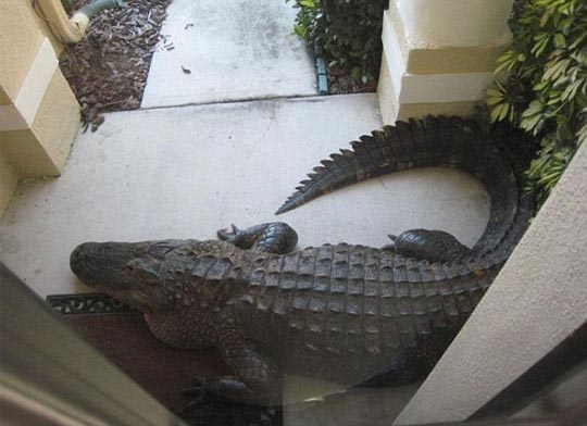 世界四月趣闻欣赏:11英尺大鳄鱼爬到住户门外困住主人