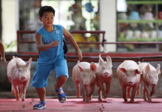 在泰国曼谷的一家动物园里,孩子们与公园里的猪们展开了比赛。
