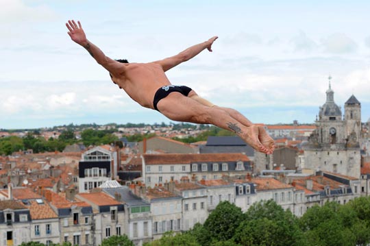 当地时间5月8日,法国举行了一场高空跳水比赛。