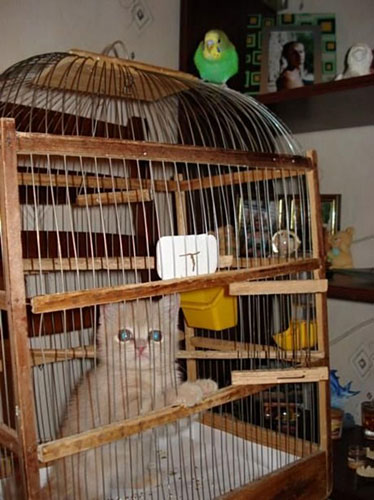 胜利属于相思鹦鹉,小猫被引入鸟笼。