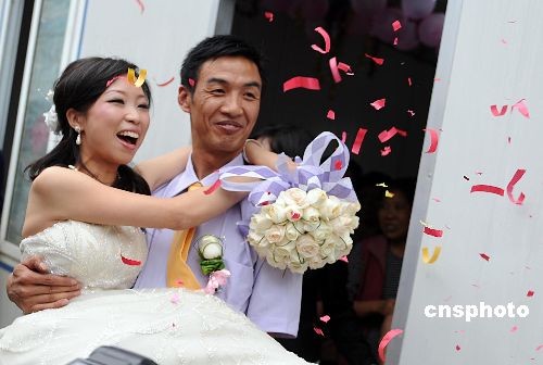 陈岩:他在5.12汶川大地震中救出29个人,被称为“中国最牛的志愿者”,“国家救援队的编外人员”。5月12日,陈岩在四川德阳迎娶自己的新娘彭露。陈岩希望用这种方式让经历阵痛的人们忘记伤悲,感觉到爱的力量,重新开始幸福的生活。中新社发 张侃 摄