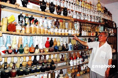 河南郑州一位酒瓶收藏者在自家建成家庭酒瓶博物馆。展示了他近30年来收藏的造型不同、大小各异的4000多个品种的酒瓶,数量上万。 中新社发 慎重 摄
