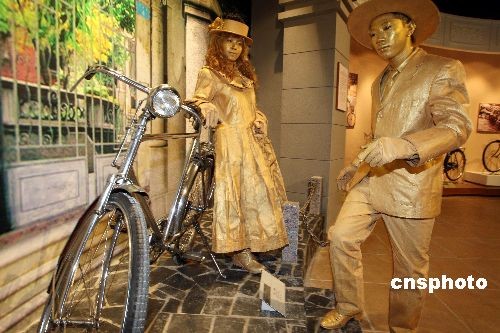 行为艺术者在河北省霸州市新落成的华夏民间收藏馆自行车博物馆内表演,表演者倚靠的是1910年英国生产的白金牌自行车。中新社发 毛建军 摄