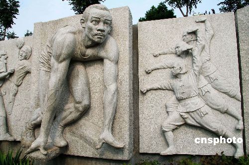 秦皇岛市奥林匹克公园是全国唯一的以奥运为内容的主题式公园。图为公园内最著名的塑像——萨马兰奇和中国小女孩,萨马兰奇坐在一条普通的椅子上,慈祥地看着不远处身着中国传统服装舞剑的小姑娘。中新社发 冯昕 摄