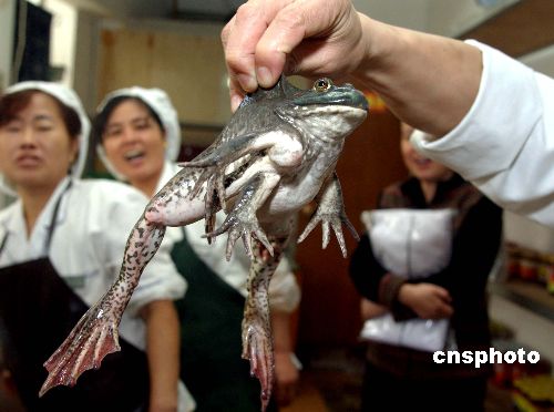11月1日,江苏镇江一酒店的厨师发现一只奇特的牛蛙,记者赶到现场看到这只牛蛙竟然长了六条腿,多出的两条腿全部长在了牛蛙前右爪的旁边,牛蛙虽然多了两条腿,但该牛蛙依然行动自如,令人称奇。中新社发 王珵 摄