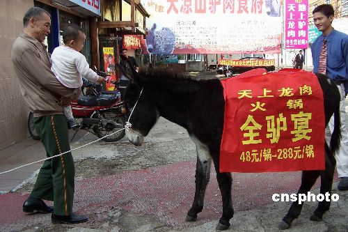 十一月二十二日,广西南宁市一家驴肉食府火锅店大打“天上龙肉 地上驴肉”等广告语,并将一头驴牵到街边,为之披上“广告衫”,以吸引食客眼球。初冬来临,南宁大街小巷众多火锅店纷纷使出各路招数,掘金冬季饮食市场。中新社发 王刚 摄