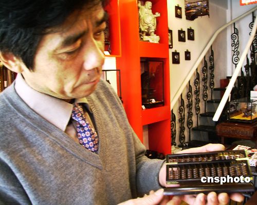 12月12日,苏州市学士街风雅堂木艺术店里有一个仅有巴掌大小的算盘吸引了市民的眼球。这个用紫檀木做成的小巧算盘,仅有15厘米长,5厘宽,做工非常精细。中新社发 李俊锋 摄