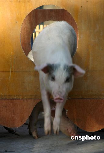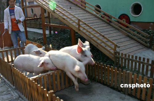 12月17日,南京红山森林动物园内的小猪们表演跨栏和钻圈,让众多游客乐开怀。中新社发 阿董 摄