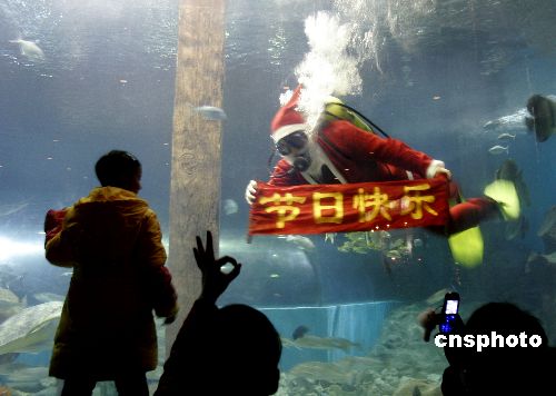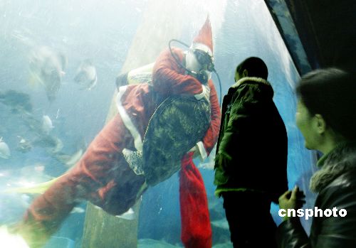 2006年12月23日,河南洛阳龙门海洋馆内,一名潜水员装扮的圣诞老人在“海底”畅游,向游客送祝福。中新社发 张晓理 摄