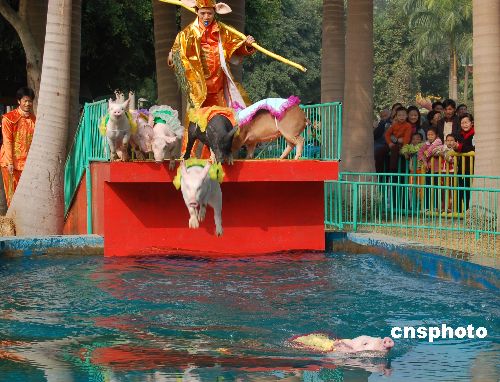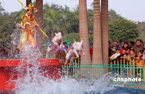 2007年1月1日,广西南宁动物园内,一位“猪八戒”装扮的人赶着一群身披彩衣的小猪进行跳水表演,以吸引游客,迎接中国农历猪年。中新社发 刘万强 摄