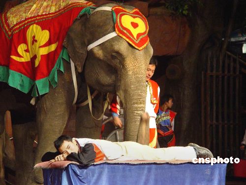 广东顺德一农庄的一头大象正在用长鼻子为游客做按摩。只见它长长的鼻子从一位先生的肩膀开始往腿部按摩,轻轻地敲,慢慢地按。据驯兽员介绍,这头大象是从泰国进口的亚洲象,现在十五岁,身高二点二米,体重三吨多,性格温柔,善解人意。中新社发 孙建驹 摄