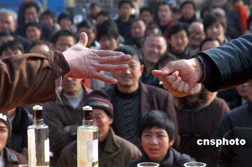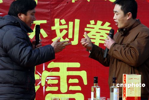 1月13日,安徽亳州一家酒厂为推销产品,举行划拳擂台赛,不少划拳高手上台展示技艺。中新社发 张延林 摄